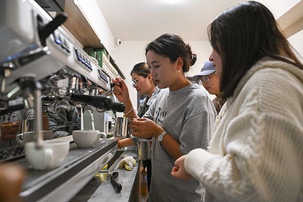 图为夜校学员上咖啡制作课。