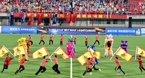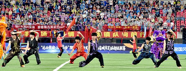 2025年8月31日晚,江西景德镇,在景德镇市体育中心内,来自该市乐平市江南武校师生正向现场10000多名球迷和观众表演精彩的文体武术节目《武韵江南》。