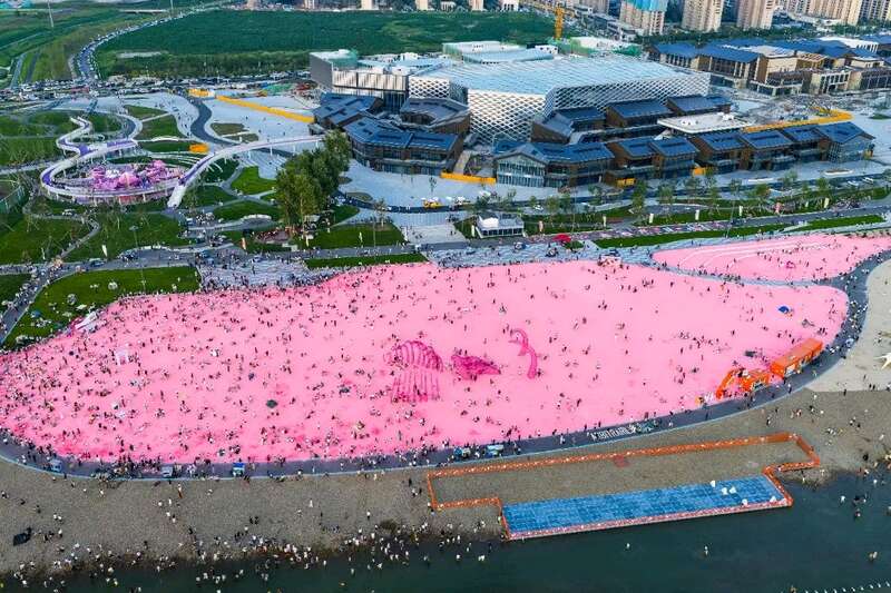 在不靠海的长春,也可以有沙滩和“赶海”公园。这个夏天,在位于长春伊通河边的肆季南河河岸公园里(以下简称“肆季南河”),打造了2万平方米的粉色沙滩、金色沙滩,内陆城市也有了类似海边度假的场景。