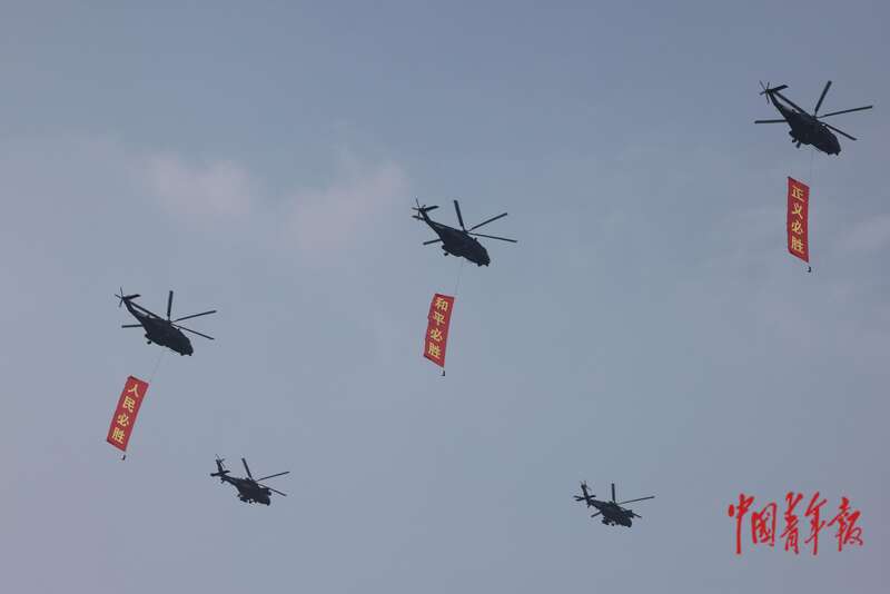 9月3日,北京,3架直升机分别悬挂“正义必胜”“和平必胜”“人民必胜”标语飞过天安门上空。中青报·中青网记者 曲俊燕/摄