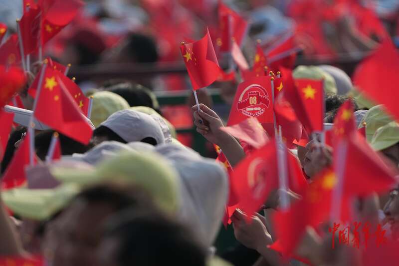 9月3日,北京天安门广场,前来观礼的观众挥舞着国旗和印有纪念大会标识的小红旗。中青报·中青网记者 李隽辉/摄