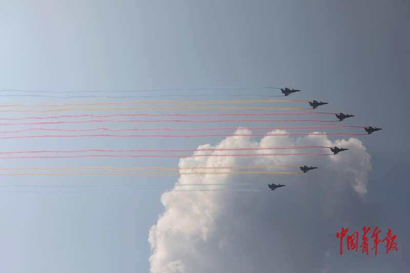 9月3日,北京,纪念大会空中梯队接受检阅,7架歼-10表演机拉出14道彩烟,寓意着中华民族14年可歌可泣的抗战历程,象征着14亿多中国人民奔向强国复兴的光明前景。中青报·中青网记者 曲俊燕/摄