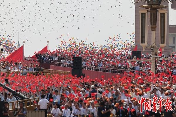 今天的天安门广场,80年前的胜利与14年间的抗战,不断在人们眼前闪现。年号台上有14只和平鸽的雕塑;联合军乐队的队形设置了14个排面、80名礼号手;26架直升机组成巨大的“80”字样队形从上空飞过;飞机拉出14道彩烟,代表14年抗战历程,也代表14亿中国人民“奔向强国复兴的光明前景”。