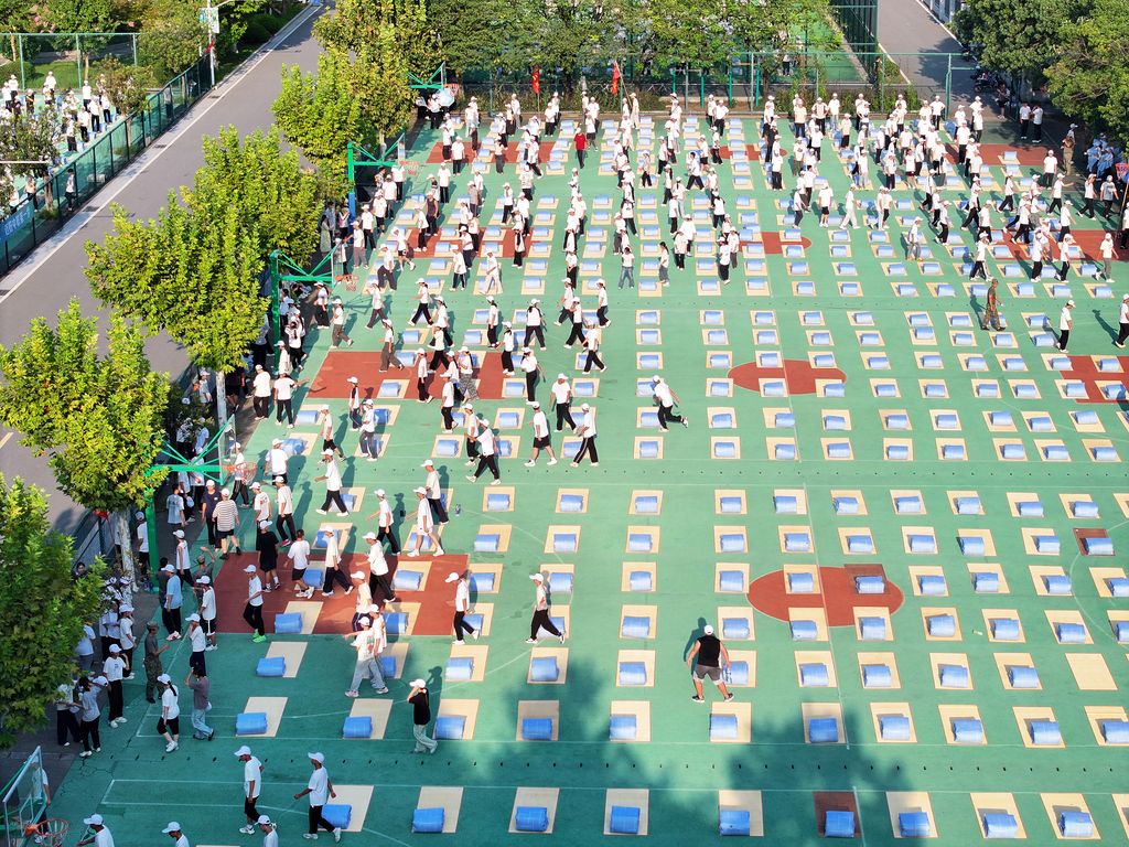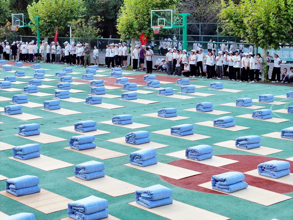 2025年9月5日,浙江东阳,东阳市职业教育中心学校东技校区军训场上,一场“千人叠被”大赛火热上演。