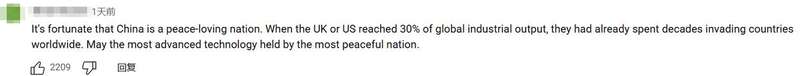 还有网友指出:“幸好中国是一个热爱和平的国家。当年英国或美国的工业产值占到全球30%时,它们早已用数十年时间在世界各地发动侵略。愿最和平的国家掌握最先进的技术。”