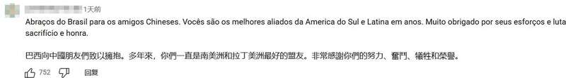 还有来自巴西的网友表示:“巴西向中国朋友们致以拥抱。多年來,你们一直是南美洲和拉丁美洲最好的盟友。非常感謝你们的努力、奋斗、牺牲和荣誉。”还有一名巴西网友表示:“我来自巴西,我想去中国旅游。中国让我感到很自豪。”