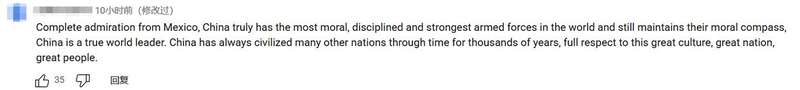 来自墨西哥的一位网友也表示“由衷敬佩”:“中国拥有世界上最具道德感、纪律最严明且实力最强大的武装力量,同时始终坚守道德准则,中国是真正的世界领导者。数千年来,中国一直以自身的文明影响着众多国家。我向这个伟大的文化、伟大的国家以及伟大的人民致以最崇高的敬意。”