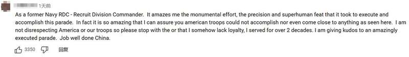 一名美国网友表示自己是“前美国海军新兵训练营指挥官”,他认为“此次阅兵的组织执行所付出的巨大努力、展现的精准水准与近乎超人的壮举,令我深感震撼。事实上,其精彩程度足以让我断言:美军根本无法完成这样的阅兵,甚至连与之接近的水平都达不到”。