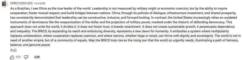 一名巴西网友留言:“我认为中国才是世界真正的领导者。领导力并非以军事力量或经济胁迫来衡量,而是要看能否推动合作、促进相互尊重,并在各国之间搭建沟通的桥梁。中国通过对话政策、基础设施投资以及推动共同繁荣,始终展现出富有建设性、包容性且具有前瞻性的领导力。”