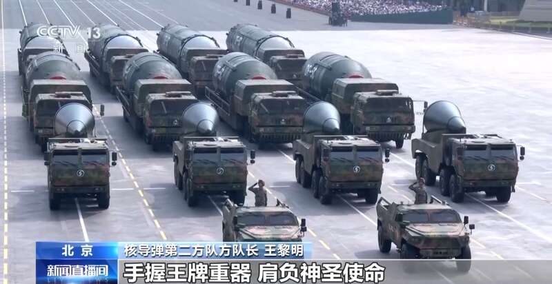 和2019年阅兵不同,这次的核导弹群并没有按照型号来划分方队,而是直接以“第一方队”“第二方队”接受检阅。其中,核导弹第一方队首次集中展示陆、海、空基“三位一体”战略核力量。