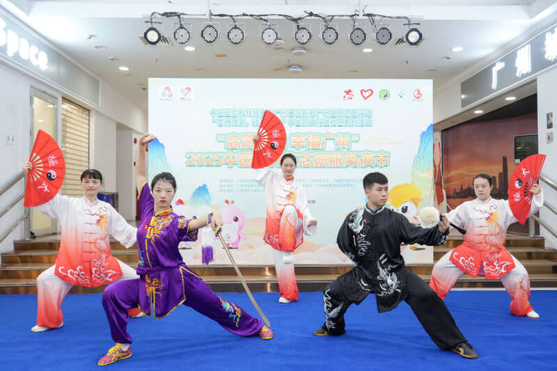 广州市青年文化宫橱窗剧场进行着“志愿者之夜”的表演,从缓慢柔和的八段锦到刚柔并济的扇子舞,各类节目吸引了不少北京路步行街上逛街的广州市民。广中医一院健身气功协会教练王宏秀主管护师介绍:“医武同源,希望能给市民们展示传统功法的魅力和底蕴,在全运会即将到来之际,提高大家的运动热情和健康素养。”