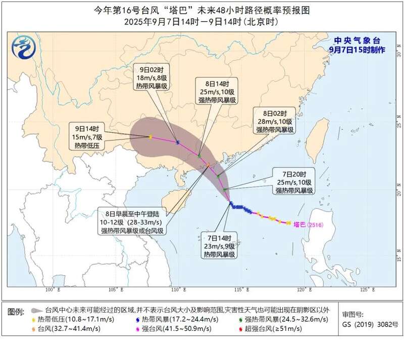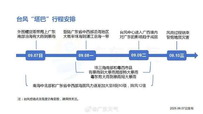 据央视新闻报道,预计“塔巴”将以每小时20到25公里的速度向西北方向移动,强度逐渐增强,较大概率于8日凌晨到中午在江门台山到茂名电白一带沿海登陆。
