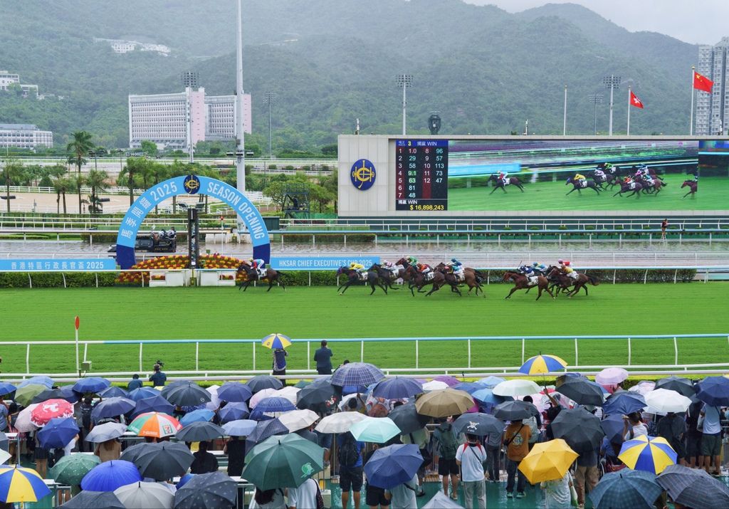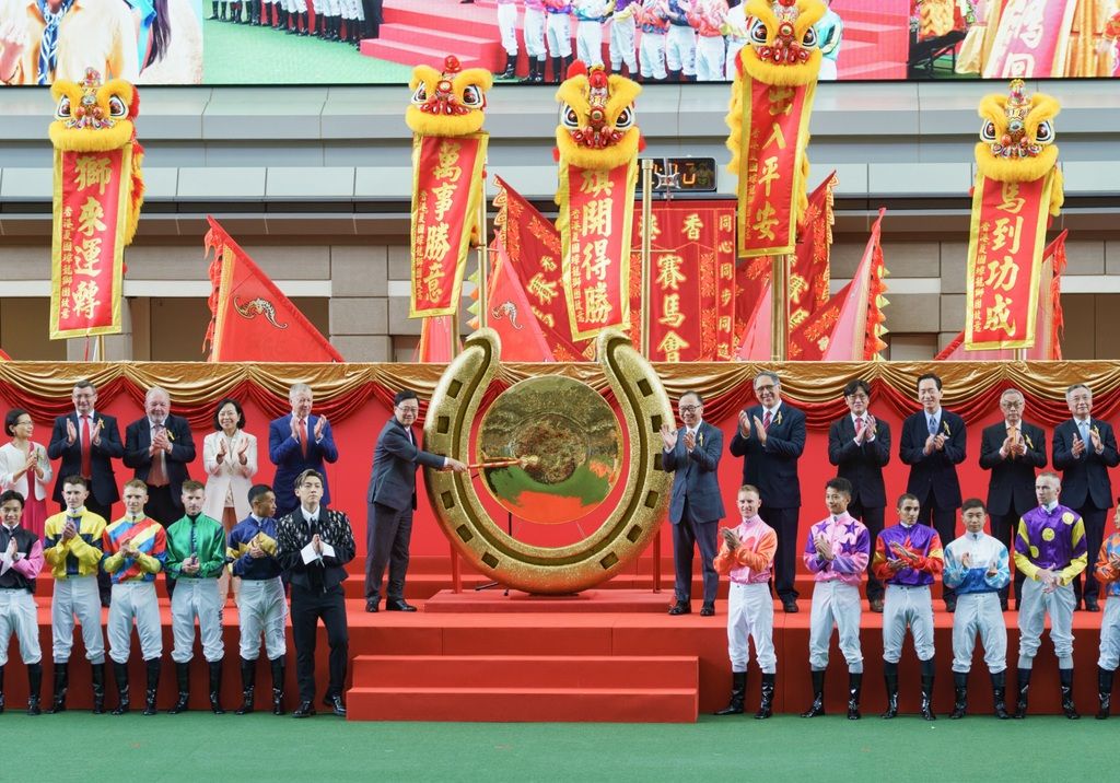 2025年9月7日,2025/2026年度香港赛马季在沙田马场鸣锣开跑。图为香港特区行政长官李家超等嘉宾为新赛马季鸣锣。 中新社记者 侯宇 摄
