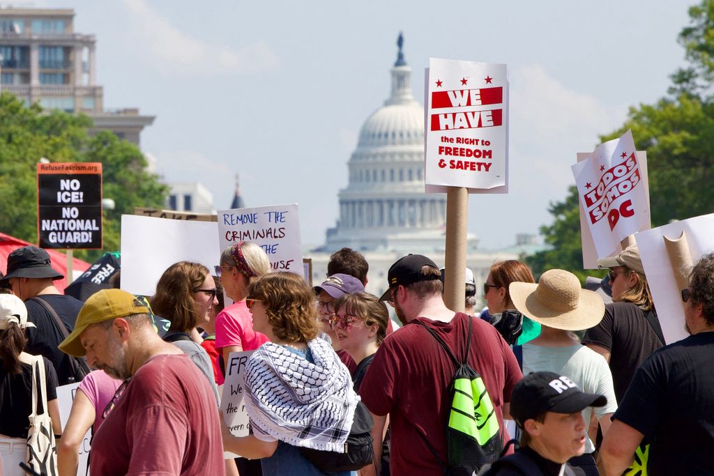当地时间2025年9月6日,美国华盛顿,抗议者在华盛顿特区举行示威活动,反对联邦政府加强对该地警察部门的控制。此次名为“我们都是特区:全国游行”的示威活动,参与者从子午线山公园游行至自由广场。