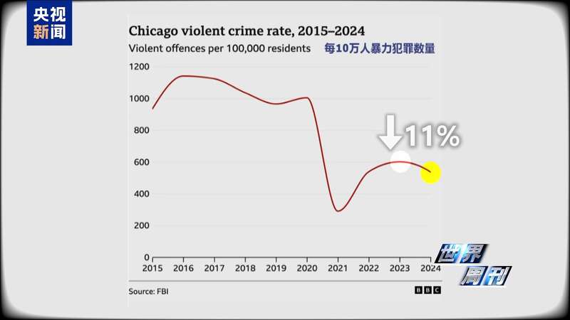 而英国广播公司援引美国联邦调查局(FBI)的数据显示,2024年,芝加哥每10万人中有540起暴力犯罪,暴力犯罪率比2023年下降了约11%。