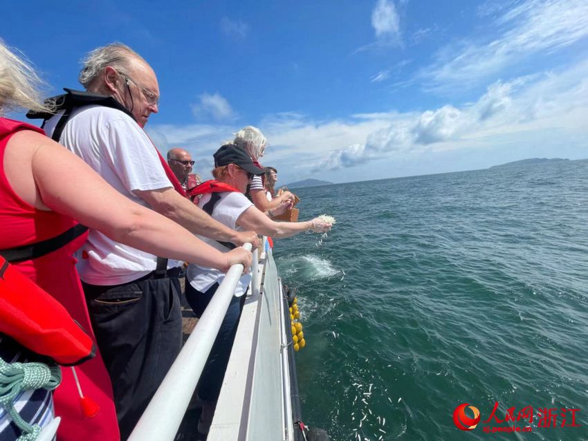 2024年6月,浙江舟山东极岛附近海域的一艘船上,75岁的丹妮丝·维尼和同船的人们一道,将手里的白色花瓣撒向大海。