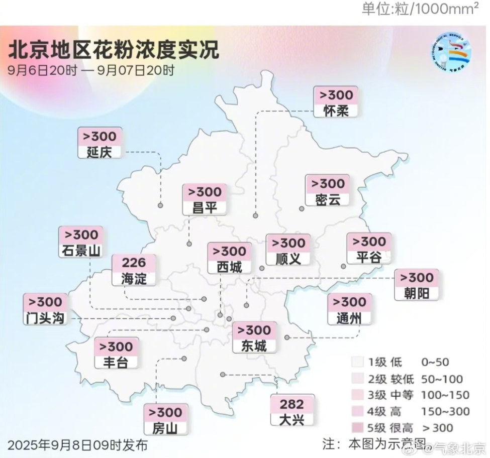 预计9月8日花粉浓度等级在4到5级,为高至很高级别(180~800粒/1000mm²)。