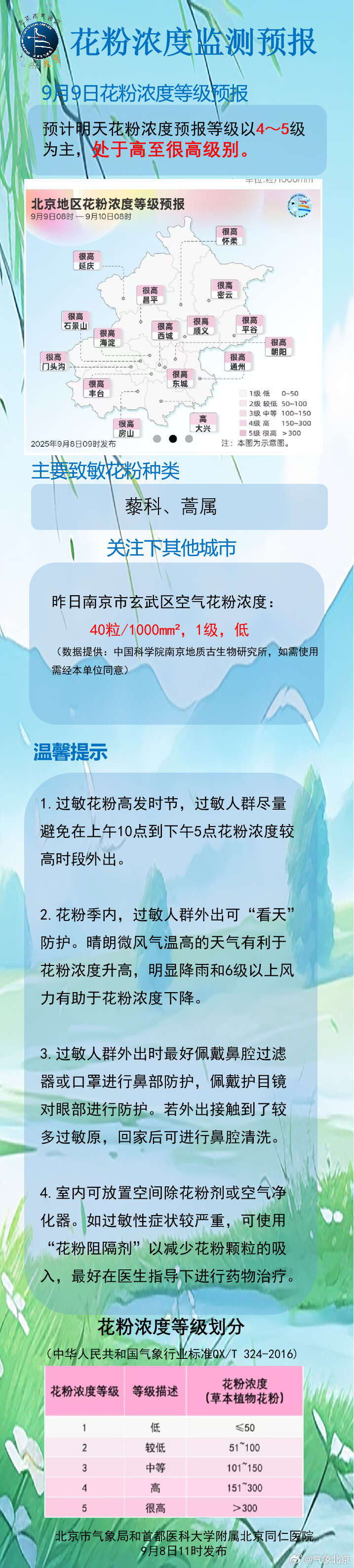 昨日北京花粉浓度等级为4到5级,大部分站点处于高至很高级别。