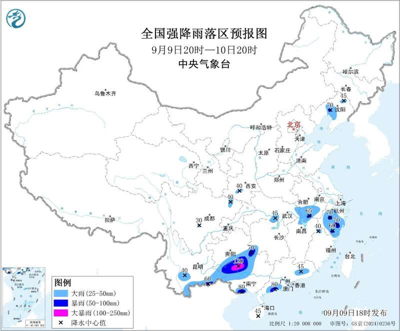 央视网消息:中央气象台9月9日18时继续发布暴雨蓝色预警:预计,9月9日20时至10日20时,广西中北部和南部沿海、贵州南部、湖南西部、广东南部、云南南部、安徽南部、江西北部、浙江大部、辽宁中部等地部分地区有大到暴雨,其中,广西西北部等地部分地区有大暴雨(100~120毫米)。上述部分地区伴有短时强降水(最大小时降雨量20~50毫米,局地可超过60毫米),局地有雷暴大风等强对流天气。