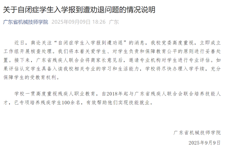9月9日,澎湃新闻(www.thepaper.cn)独家刊发广东一自闭症学生被录取后在报到当天又遭劝退的消息引发社会关注。当晚,广东省机械技师学院在其公众号发布《关于自闭症学生入学报到遭劝退问题的情况说明》,对此事进行了回应。