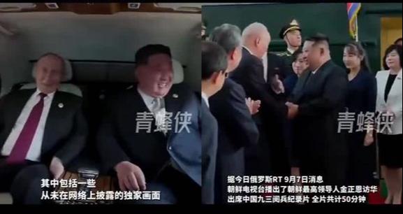 朝鲜电视台播出金正恩出席九三阅兵纪录片 首次公开与俄总统普京车内交谈、茶叙画面