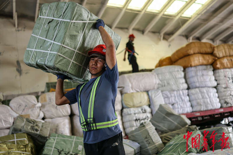 9月9日,新疆霍尔果斯丝路荣腾物流有限公司,一名年轻工人在搬运货物。中青报·中青网记者 曲俊燕/摄