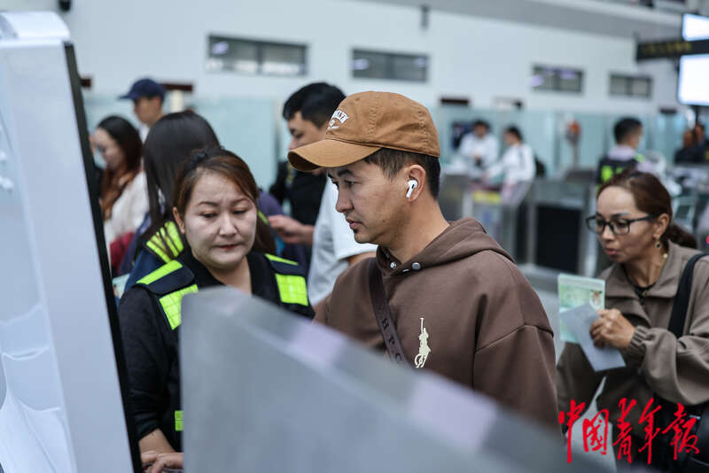 9月9日,新疆霍尔果斯公路口岸第六代国门,一名哈萨克斯坦旅客通过自助机办理入关手续。中青报·中青网记者 曲俊燕/摄