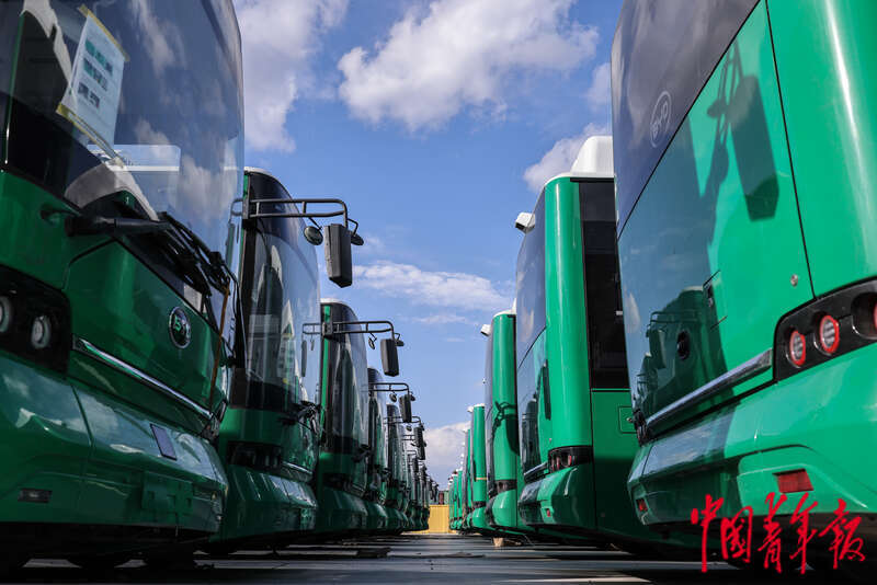 9月9日,新疆霍尔果斯丝路荣腾物流有限公司,即将出口的比亚迪新能源公交车整齐排列。中青报·中青网记者 曲俊燕/摄