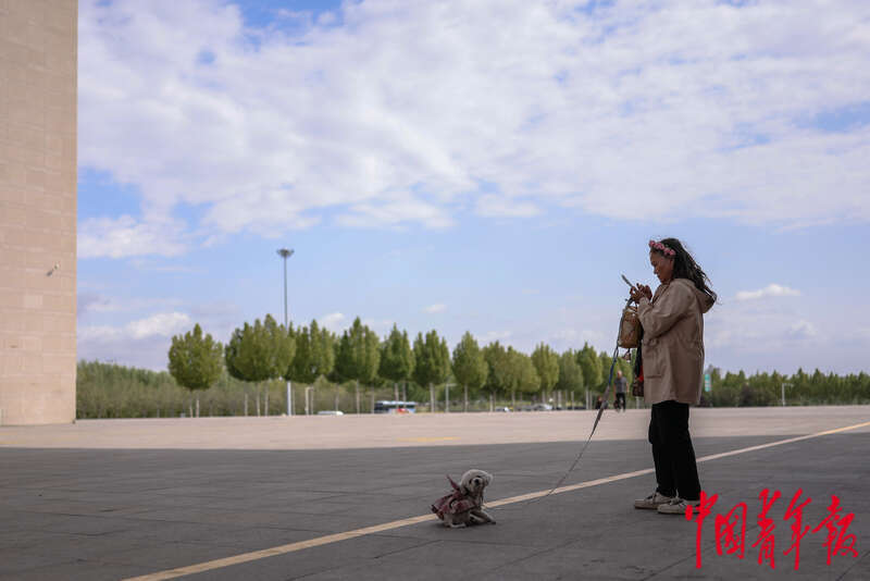 9月9日,新疆霍尔果斯公路口岸第六代国门前,一名游客牵着小狗游玩。中青报·中青网记者 曲俊燕/摄