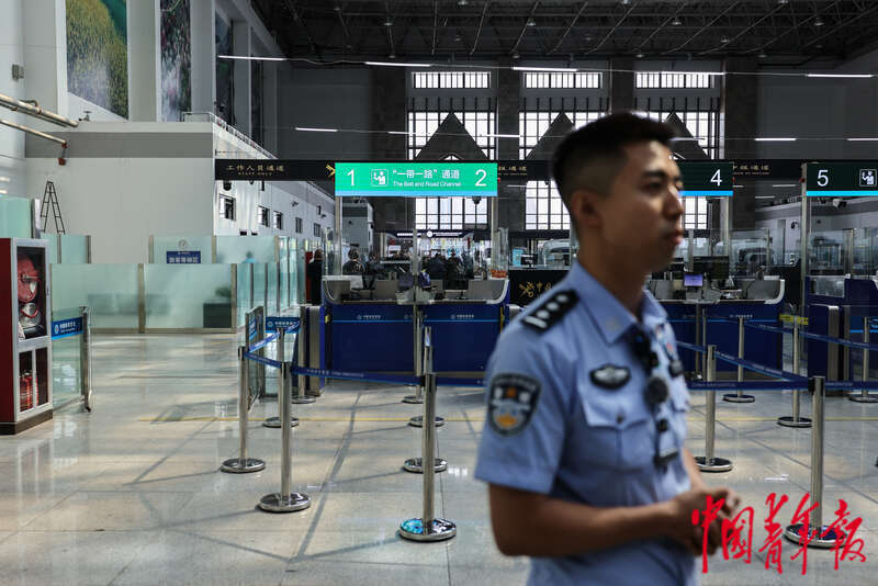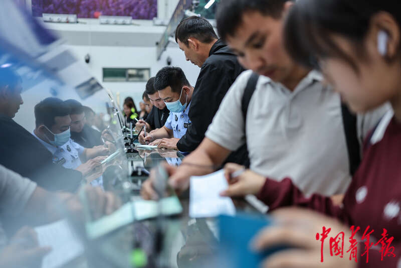 9月9日,新疆霍尔果斯公路口岸第六代国门,边防执勤人员在协助哈萨克斯坦旅客填写入境卡。霍尔果斯位于中国和哈萨克斯坦边境,往来旅客以跨境旅游、商贸考察和探亲访友为主。截至8月21日,今年霍尔果斯口岸出入境旅客已突破100万人次,同比增长60%,创历史新高。中青报·中青网记者 曲俊燕/摄