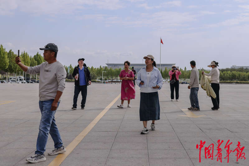 9月9日,新疆霍尔果斯公路口岸第六代国门附近,游客们在参观拍摄。中青报·中青网记者 曲俊燕/摄