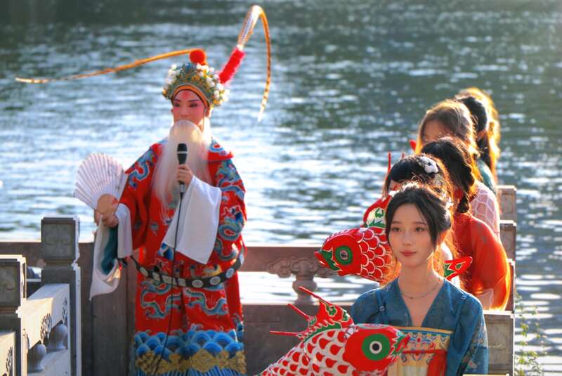 本次活动共分三个单元内容。一是“东风更放花千树”,包括傩戏面具、木刻版画、绒花、民俗服饰等徽州传统工艺品非遗文创展示,大幅藤编、大型鱼灯、大型剪纸等传统艺术作品展,以及书法、国画、葫芦刻画等手工艺作品展;二是“玉壶光转舞鱼龙”,在热闹的锣鼓声中,鱼灯巡游、轩辕滚车、舞龙舞狮从学校光启堂出发,最后汇聚日月广场;三是“九天钧乐奏云韶”,青年师生开展黄梅戏展演,演出《天仙配》《女驸马》等知名唱段。