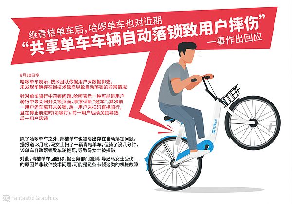 最近有市民反映,自己在骑行共享单车的过程中遇到“突如其来的刹车”,导致摔伤。媒体调查发现,类似的情况曾在上海、北京、广东等多地发生,涉及多个平台的共享单车,至少有41起。