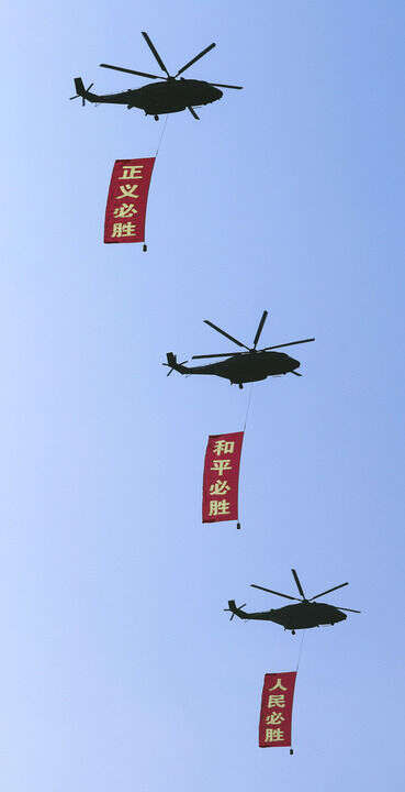 2025年9月3日,纪念中国人民抗日战争暨世界反法西斯战争胜利80周年大会在北京隆重举行。这是空中护旗梯队通过天安门广场,3架直-8L运输直升机分别悬挂“正义必胜”“和平必胜”“人民必胜”条幅。新华社记者 李钢 摄