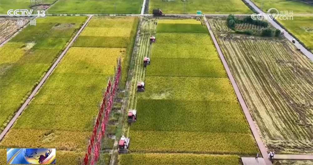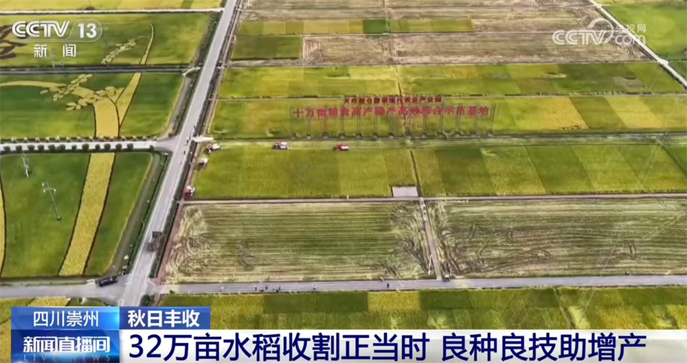 央视网消息:眼下,位于四川崇州的32万亩水稻进入收割季,多台收割机联合作业,切割、脱粒、装车一气呵成。借助“良种良技”,今年,崇州市水稻亩产最高达到了700公斤,比去年提升了大约5%。