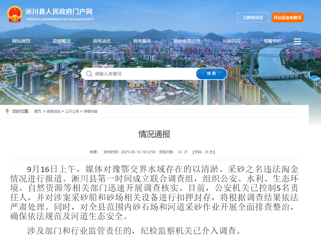 9月16日上午,媒体对豫鄂交界水域存在的以清淤、采砂之名违法淘金情况进行报道。淅川县第一时间成立联合调查组,组织公安、水利、生态环境、自然资源等相关部门迅速开展调查核实。目前,公安机关已控制5名责任人,并对涉案采砂船和砂场相关设备进行扣押封存,将根据调查结果依法严肃处理。同时,对全县范围内砂石场和河道采砂作业开展全面排查整治,确保依法规范及河道生态安全。