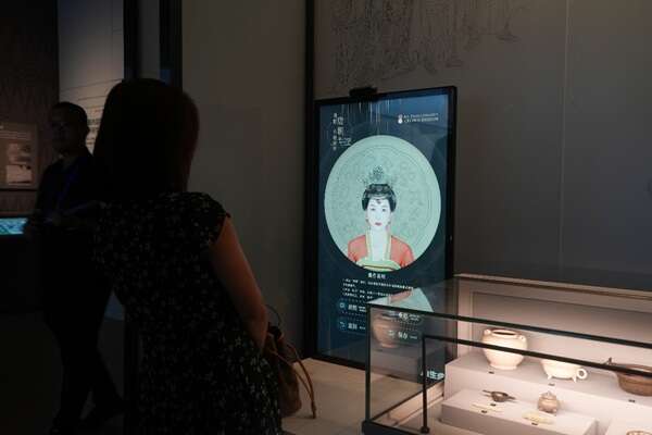 李倕冠饰是中国第一个通过实验室微观发掘科学复原的冠饰,在一旁的电子互动屏上,其细节能够逐一放大欣赏。若有观者希望“上头”体验一把大唐遗风,现场拍照、等待数秒,人工智能就会发来形象逼真的“古装照”。