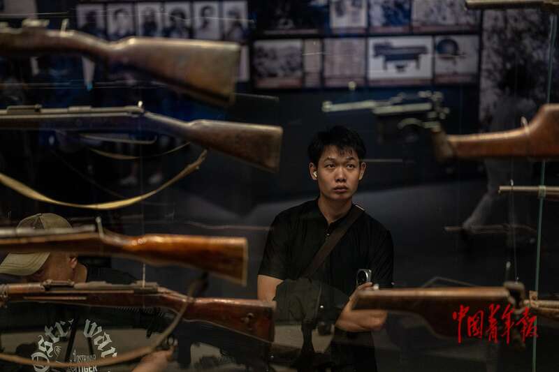 9月16日,辽宁省沈阳市“九·一八”历史博物馆,一位年轻人在观看东北抗联战士使用过的枪械。中青报·中青网记者 李隽辉/摄