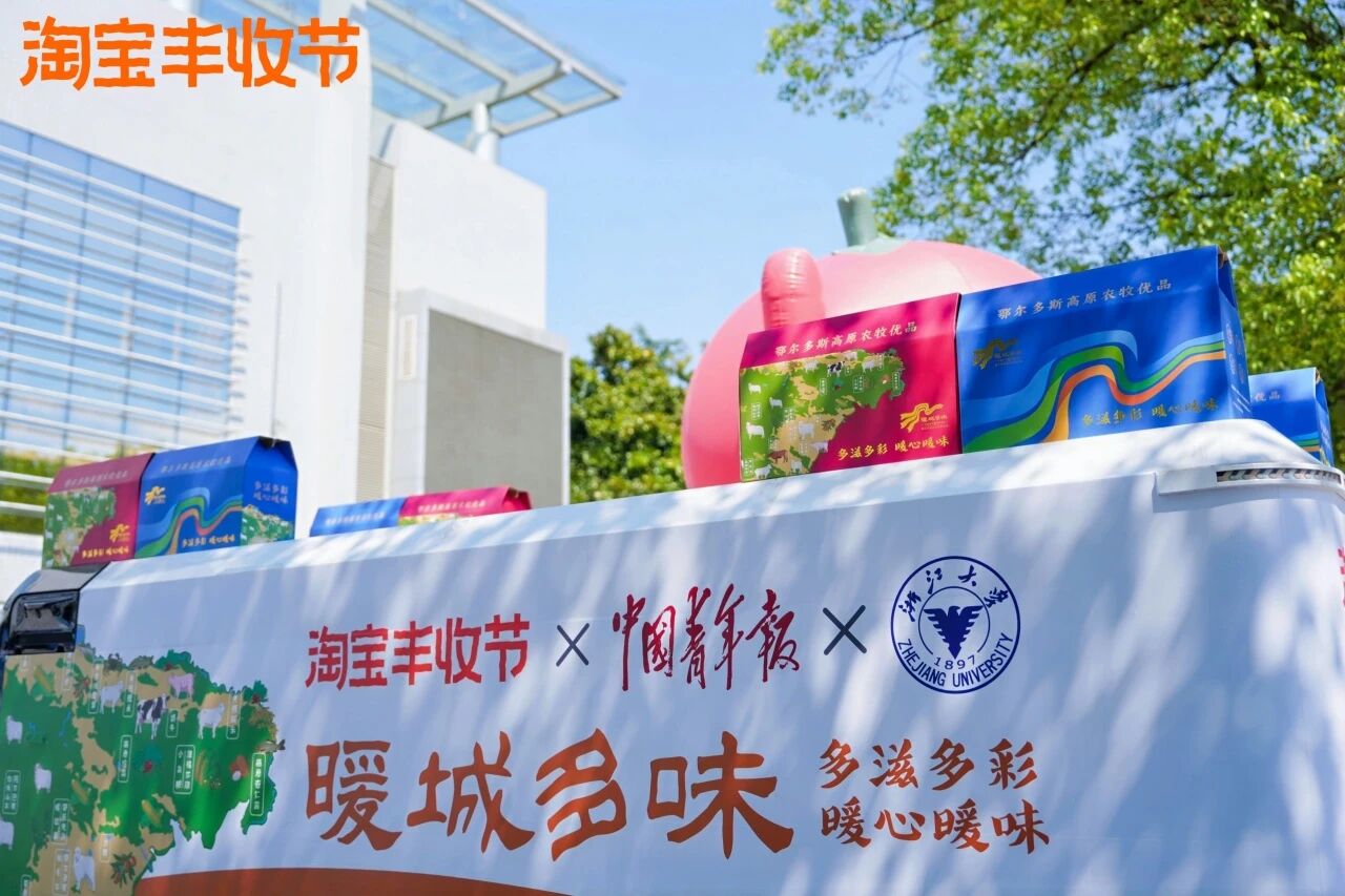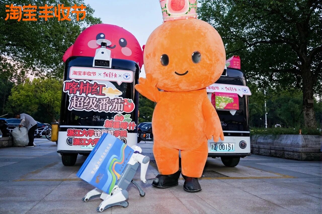 活动当天,“热血追‘番’号”和“暖城多味”两辆主题花车亮相浙江大学校园。热血追“番”号以动漫热血番的风格,演绎出佳景喀柿红水果番茄的科研历程,暖城多味则展示出浙江大学携手鄂尔多斯结合乡村振兴战略合作开发出的多款高原农牧优品,呈现出校地携手推动乡村产业发展的落地成果。身穿新疆特色风格服饰的“淘小宝”也伴随主题花车亮相,憨态可掬的淘小宝与浙大学子亲切互动,为丰收节活动注入趣味与活力。
