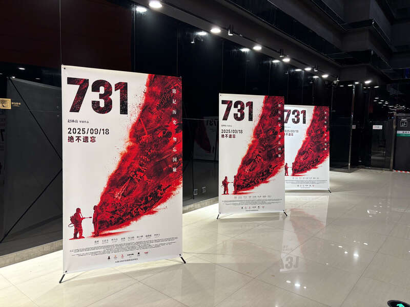 9月17日下午,黑龙江哈尔滨,电影《731》举办了全球首映式。影院内,陈列着许多电影宣传板。中青报·中青网记者 杨雷/摄