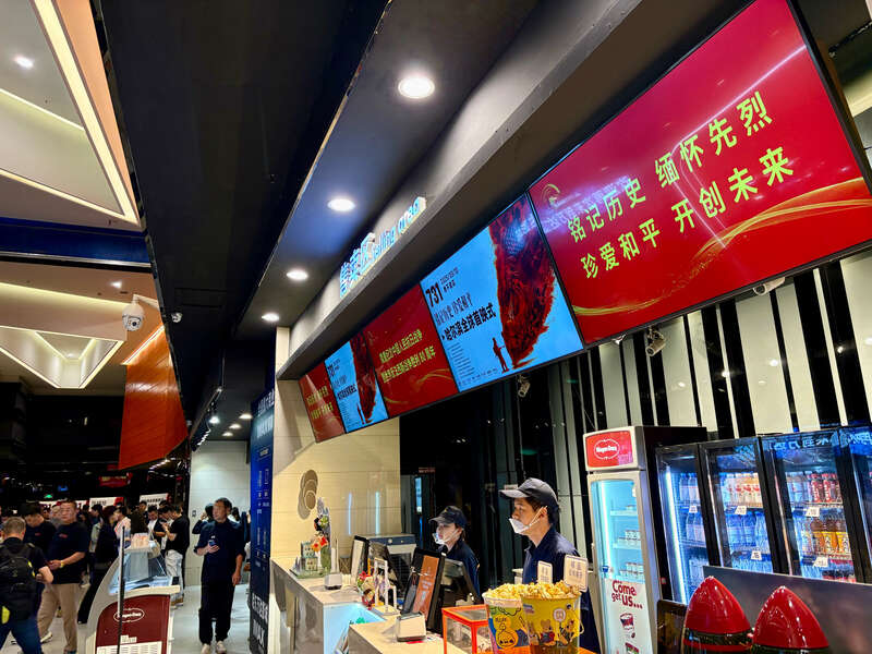 9月17日下午,黑龙江哈尔滨,电影《731》举办了全球首映式。影院商品销售区上部的显示屏,已换成了电影海报。中青报·中青网记者 杨雷/摄