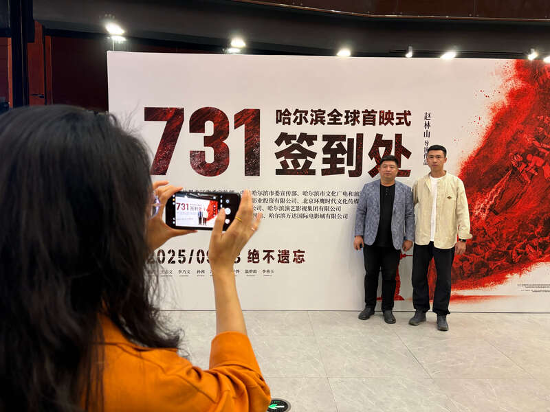 9月17日下午,黑龙江哈尔滨,受邀前来观影的人们,在电影《731》首映式展板前合影留念。当日,电影《731》全球首映仪式在哈尔滨举行。总制片人张望表示:“80年前,我们用鲜血赢得和平;80年后,我们以电影守护记忆。《731》就像一盏灯,照亮那些可能被遗忘的角落。”中青报·中青网记者 杨雷/摄