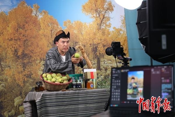9月9日,新疆巴音郭楞蒙古自治州尉犁县直播基地,24岁的喀比力·喀地尔正在直播带货,销售香梨、罗布麻原叶等当地特产。该基地2024年实现销售额1.7亿元,成为全疆名优特产品线上集中展示的窗口。其中,年轻人扛起了疆货出疆的大旗,尉犁县电子商务协会牵头的直播队伍中,主播的平均年龄约26岁。中青报·中青网记者 王鑫昕/摄