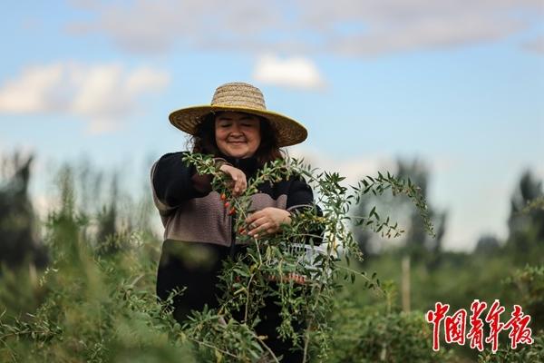 9月11日,新疆博尔塔拉蒙古自治州精河县吾夏克巴依西村,地丽努尔在采摘枸杞。她来自邻村永集湖村,每年夏秋两季来这里摘枸杞。吾夏克巴依西村是精河县枸杞核心种植区,自20世纪70年代开始种植枸杞,全村现有枸杞种植面积4600亩。通过产业链延伸和技术升级,该村枸杞产业产值大幅提升,带动村民人均收入增加近1000元,采摘季为周边提供大量季节性就业岗位。中青报·中青网记者 曲俊燕/摄