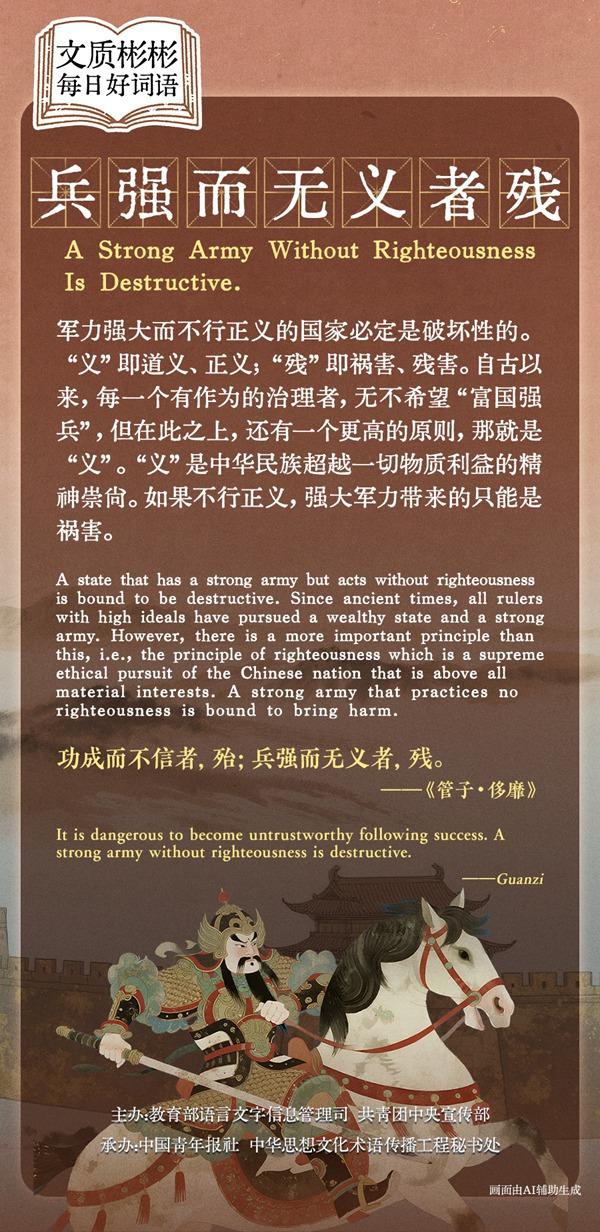 A state that has a strong army but acts without righteousness is bound to be destructive. Since ancient times, all rulers with high ideals have pursued a wealthy state and a strong army. However, there is a more important principle than this, i.e., the principle of righteousness which is a supreme ethical pursuit of the Chinese nation that is above all material interests. A strong army that practices no righteousness is bound to bring harm.