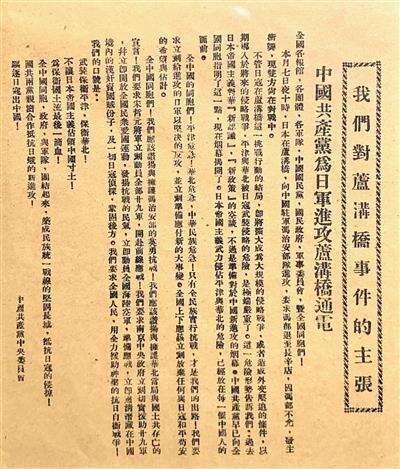 九一八事变后的第三天,中共中央发表宣言,号召全中国工农劳苦民众“一致动员武装起来,给日本强盗与一切帝国主义以严重的回答”。七七事变后的第二天,中共中央向全国发出通电,号召“筑成民族统一战线的坚固长城,抵抗日寇的侵掠”。七七事变成为中国全民族抗战的开端,由此开辟了世界反法西斯战争的东方主战场。