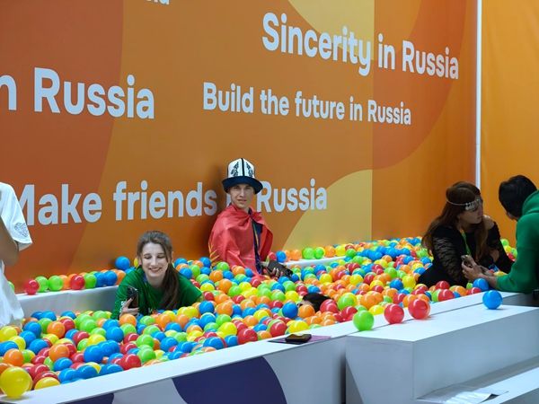 9月18日,俄罗斯下诺夫哥罗德,2025年世界青年联欢节在俄罗斯下诺夫哥罗德开幕。图为主办方为参会青年准备了海洋球。中青报·中青网驻俄罗斯记者 赵祺/摄