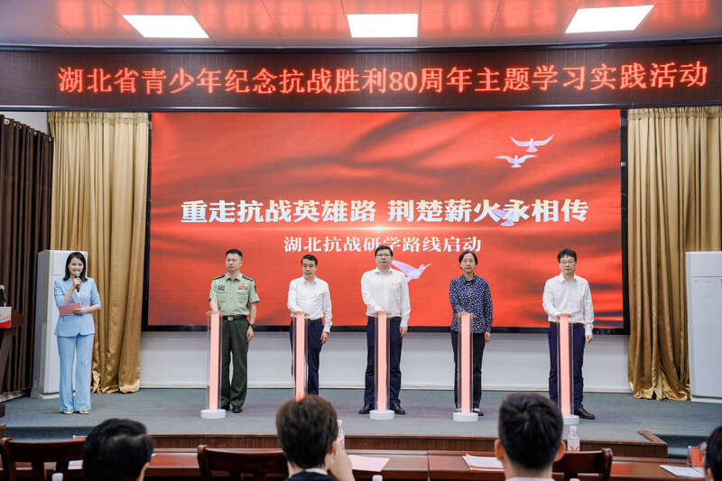 各主办单位领导共同发布了“重走抗战英雄路 荆楚薪火永相传”湖北省青少年纪念抗战胜利80周年研学线路。(团湖北省委宣传部供图)