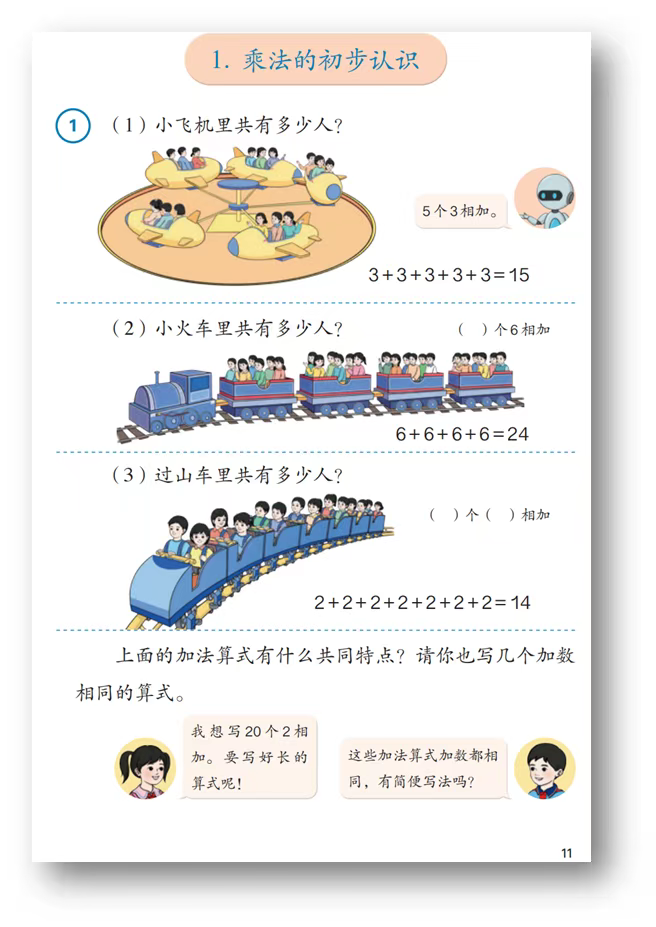 用大白话说, 在孩子刚学习乘法的意义时,之所以只给出了一种算式,即相同加数在前,相同加数的个数在后,为的是和情境更对应,方便学生理解乘法的意义。但是,学会了后,后面的要求就没有这么严格了。