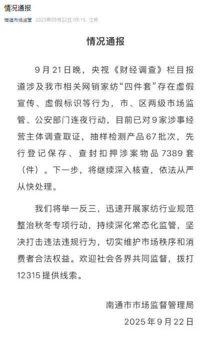 江苏省南通市市场监督管理局9月22日发布情况通报,针对此前总台《财经调查》栏目报道涉及南通市相关网销家纺“四件套”存在虚假宣传、虚假标识等行为,南通目前已对9家涉事经营主体调查取证,下一步将深入核查,依法从严从快处理。通报详情如下: